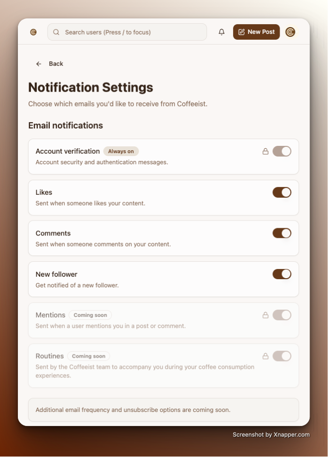 We also have a Notifications settings page, so you can opt out by type. No spam. Just a nudge when your coffee gets love.
