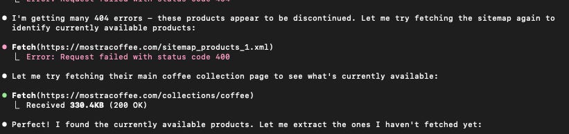 Bulk mode works, but Claude Pro sessions cap quickly. My very high-tech workaround is to resume between baby feeds. A fun surprise: if a sitemap returns many 404s, Claude Code pivots to a category page and continues with in-stock items it has not seen yet.